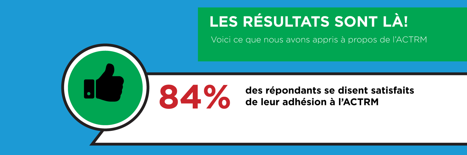 Conformément à l’engagement de l’ACTRM d’offrir à ses membres des programmes et des services qui satisfont à leurs besoins, vous auriez déjà reçu votre invitation à participer au sondage 2016 de l’ACTRM sur la satisfaction des membres. Votre participation est essentielle pour nous aider à connaitre le degré de satisfaction générale des membres et déterminer comment l’ACTRM répond aux besoins de ses membres.