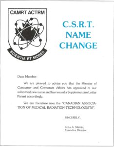 Les fondateurs de la SCTR ont retenu la désignation de l’Alberta, et choisi un nom qui selon eux devrait survivre pendant plusieurs décennies. Ils ne pouvaient cependant pas concevoir l’ampleur des avancées technologiques et professionnelles à venir en imagerie médicale et en radiothérapie ni savoir que la nécessité de suivre cette évolution comprendrait celle d’adapter le nom de la profession et celui de l’association.