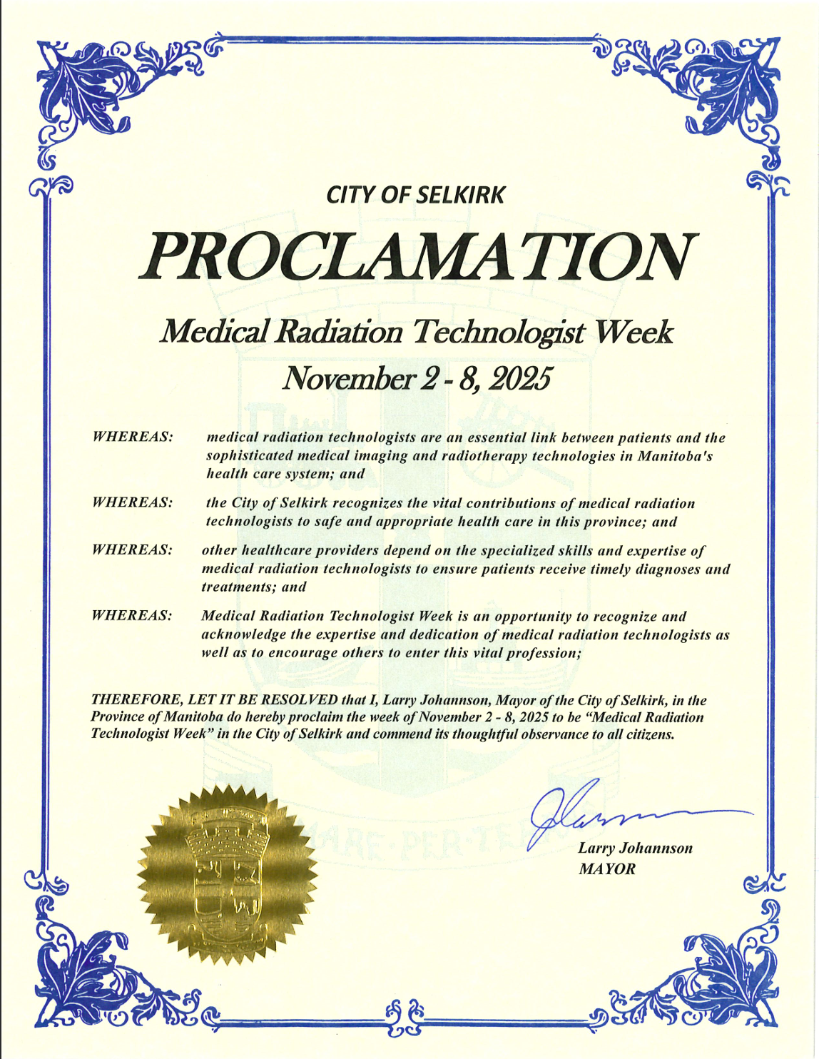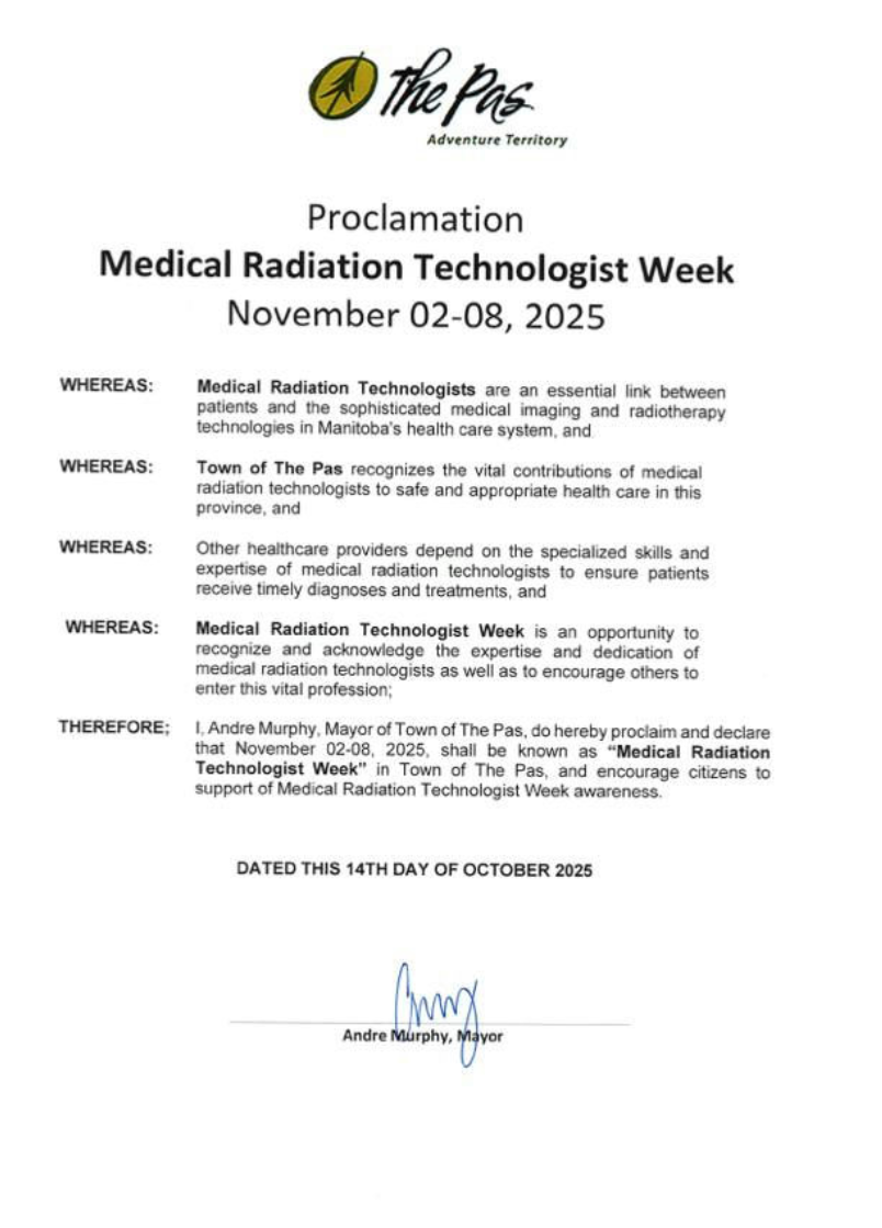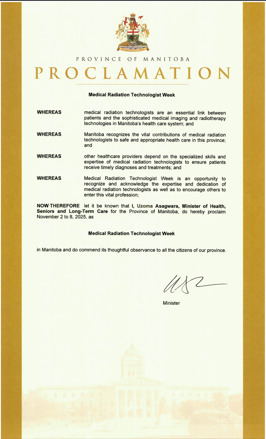 We are also proud to announce that the Honorable Uzoma Asagwara, Minister of Health, Seniors and Long-Term Care has sent greetings and has Proclaimed November 5-11 as Medical Radiation Technologists Week in Manitoba. View the Proclamation here, and view the greeting from the Health Minister here.