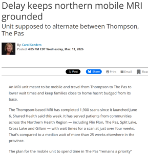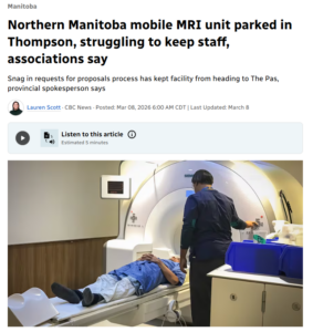 - March 11, 2026 – Winnipeg Free Press interview for the story “Delay keeps northern mobile MRI grounded”. Check out the story here: Delay keeps northern mobile MRI grounded – Winnipeg Free Press