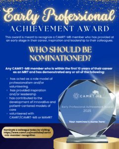 Nominations for the 2025 Awards Program are now CLOSED. Thank you to those that took the time to submit a nomination this year. Award winners were announced at the CAMRT-MB Awards and Networking Event on Wednesday, October 15, 2025. Information about the 2025 Award Recipients can be found HERE.