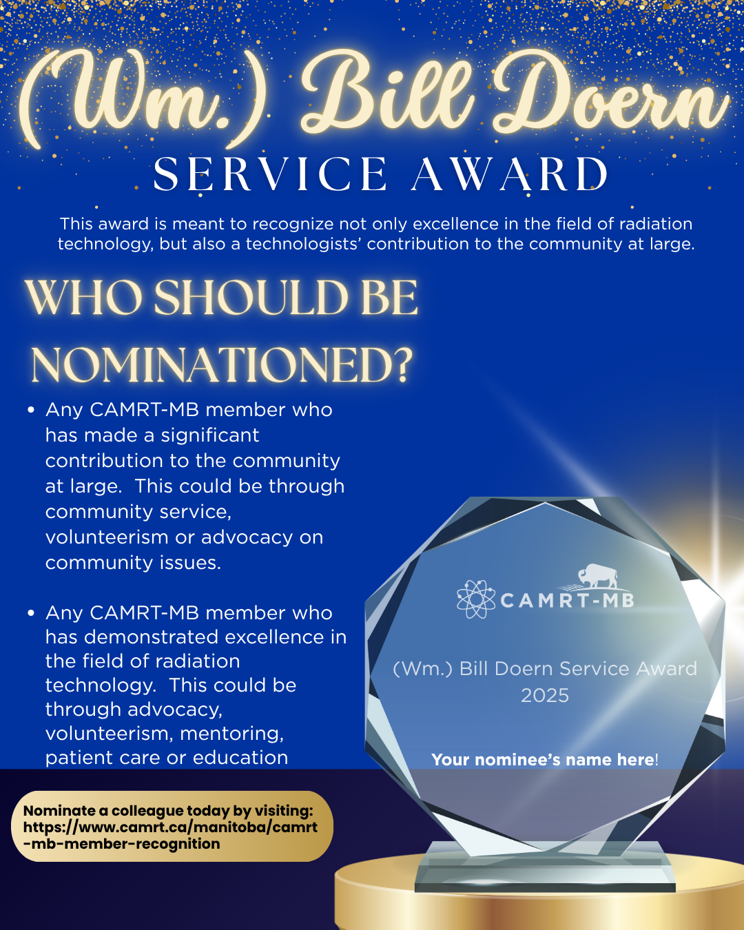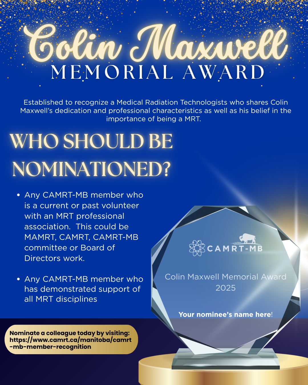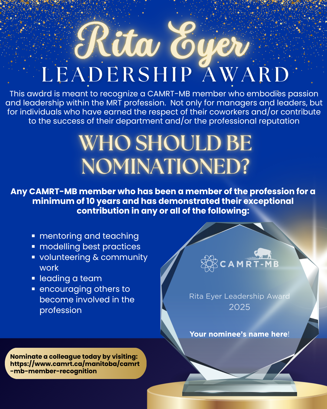 The CAMRT-MB Awards Program was established to recognize and celebrate our members who have made outstanding contributions to our profession, community, or organization through leadership, dedication and service. These awards serve to highlight the exceptional efforts and achievements of our members, inspiring others and strengthening our professional community. However, we can only honor those who are brought forward through nominations. If you know someone deserving, take the time to submit a nomination-your input is essential to ensuring that their hard work and impact do not go unnoticed.