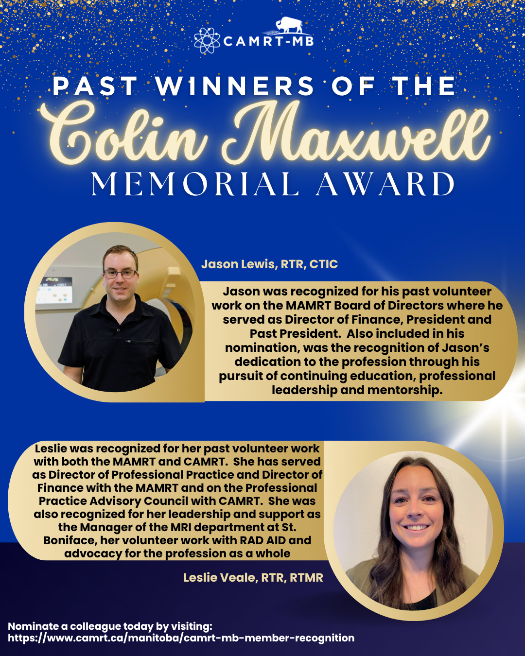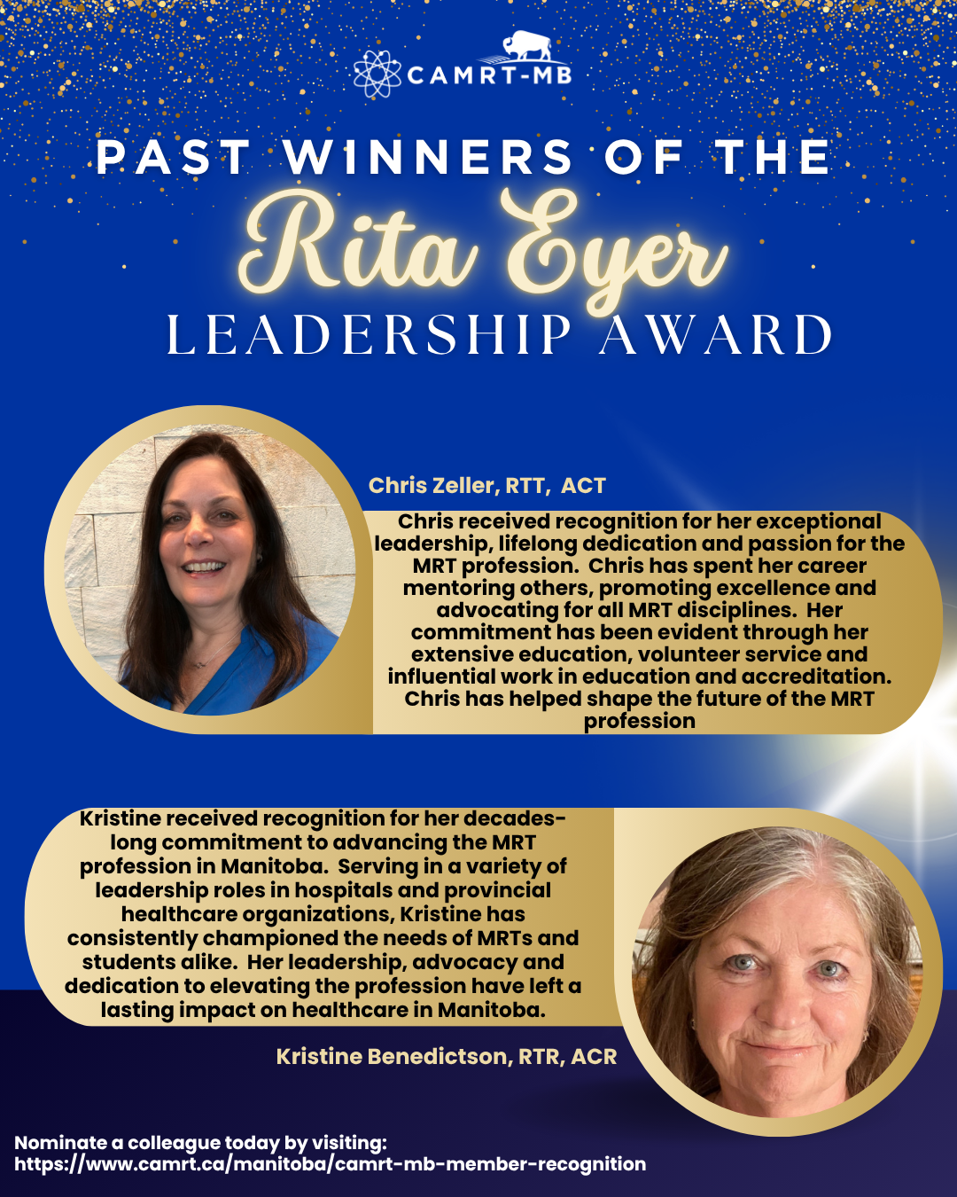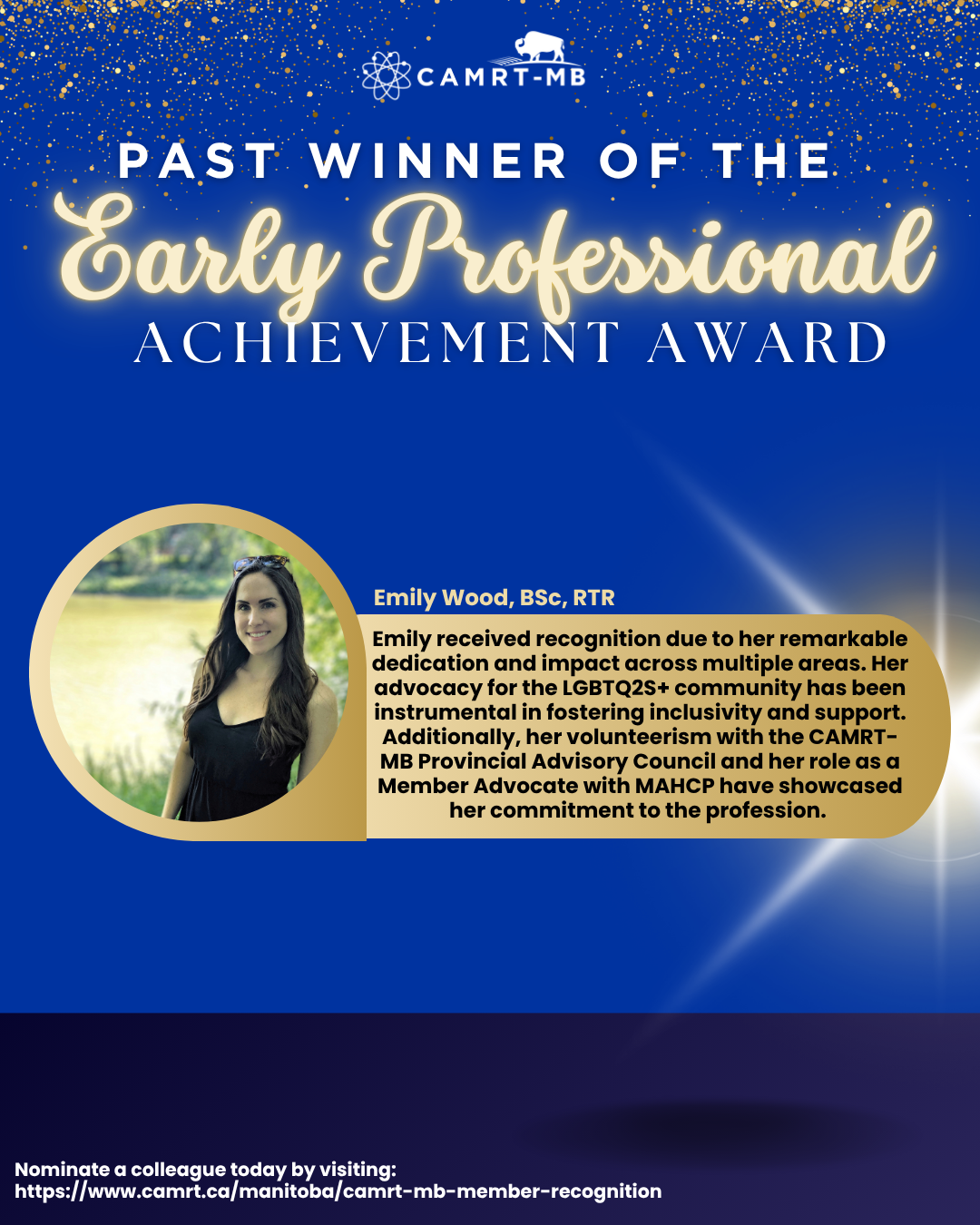 The CAMRT-MB Awards Program was established to recognize and celebrate our members who have made outstanding contributions to our profession, community, or organization through leadership, dedication and service. These awards serve to highlight the exceptional efforts and achievements of our members, inspiring others and strengthening our professional community. However, we can only honor those who are brought forward through nominations. If you know someone deserving, take the time to submit a nomination-your input is essential to ensuring that their hard work and impact do not go unnoticed.